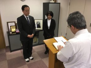 今年の教団総会にて、これからの国外宣教ビジョンの実現にむけて国外宣教総主事制を導入することが公表されました。そして、去る4月23日に行われた国外宣教委員会にて飯田仰総主事と飯田晶子主事の就任式を無事に執り行う事ができました。国外宣教総主事はこれから各宣教区を訪問させていただくほか、各宣教地を巡回して、宣教師たちのサポートを開始していく予定です。新しく立てられた国外宣教総主事と国外宣教主事の働きを覚えてお祈りください。以下は教団事務所で行われた就任式の写真です。